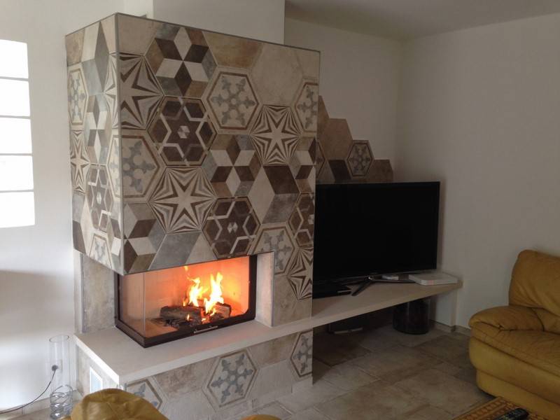 Et pourquoi pas de la faïence sur votre cheminée ? Une cheminée originale et atypique avec ces carreaux hexagonaux.