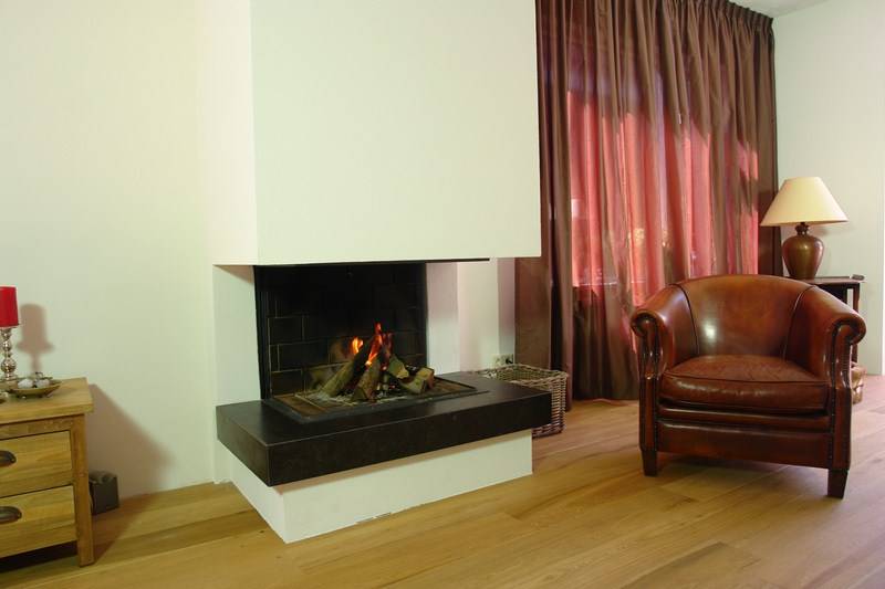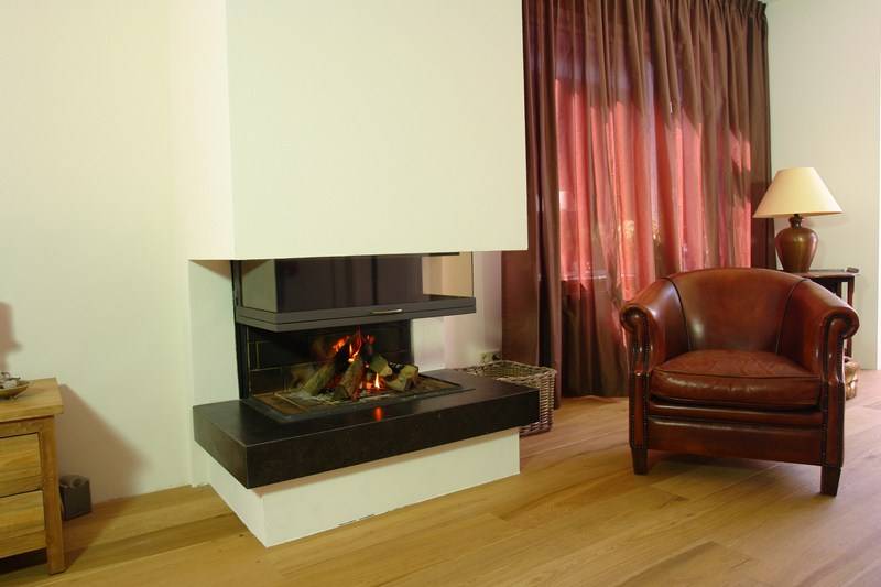Sur ces photos vous pouvez voir la cheminée en fonctionnement porte ouverte, en effet la porte s’escamote complétement pour une vision totale de la flamme.