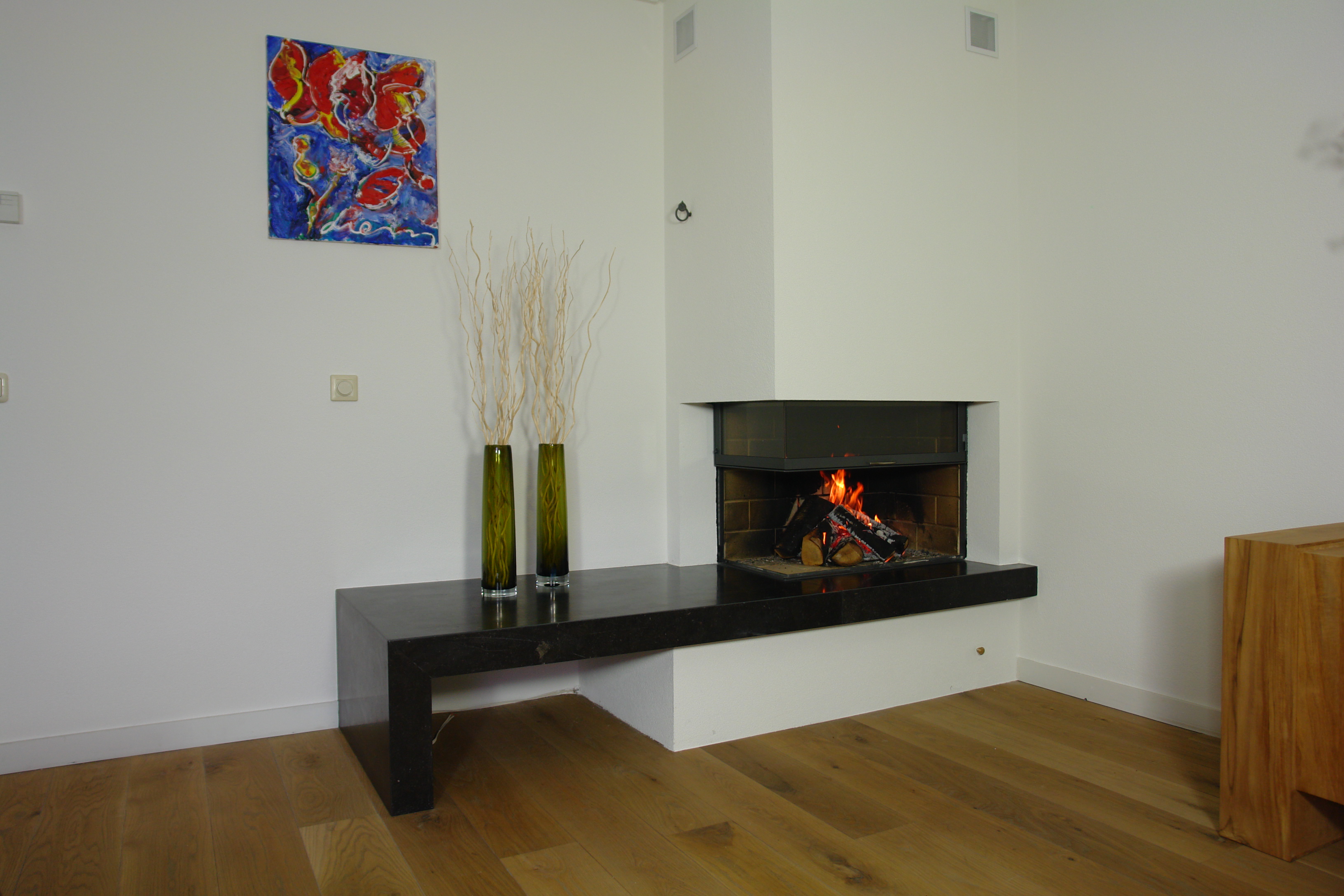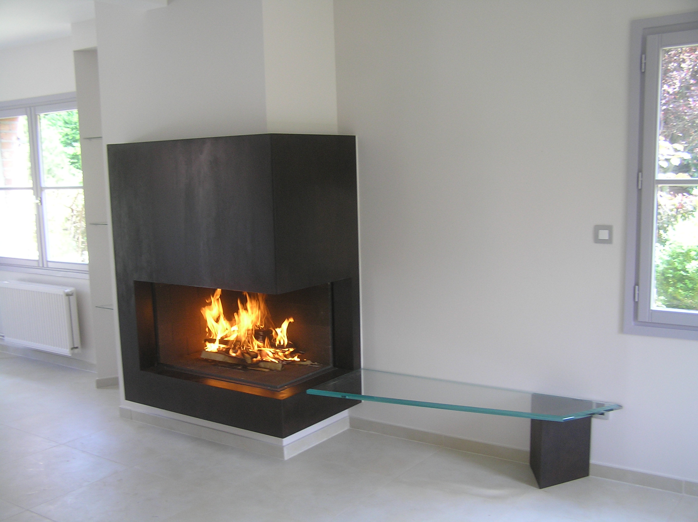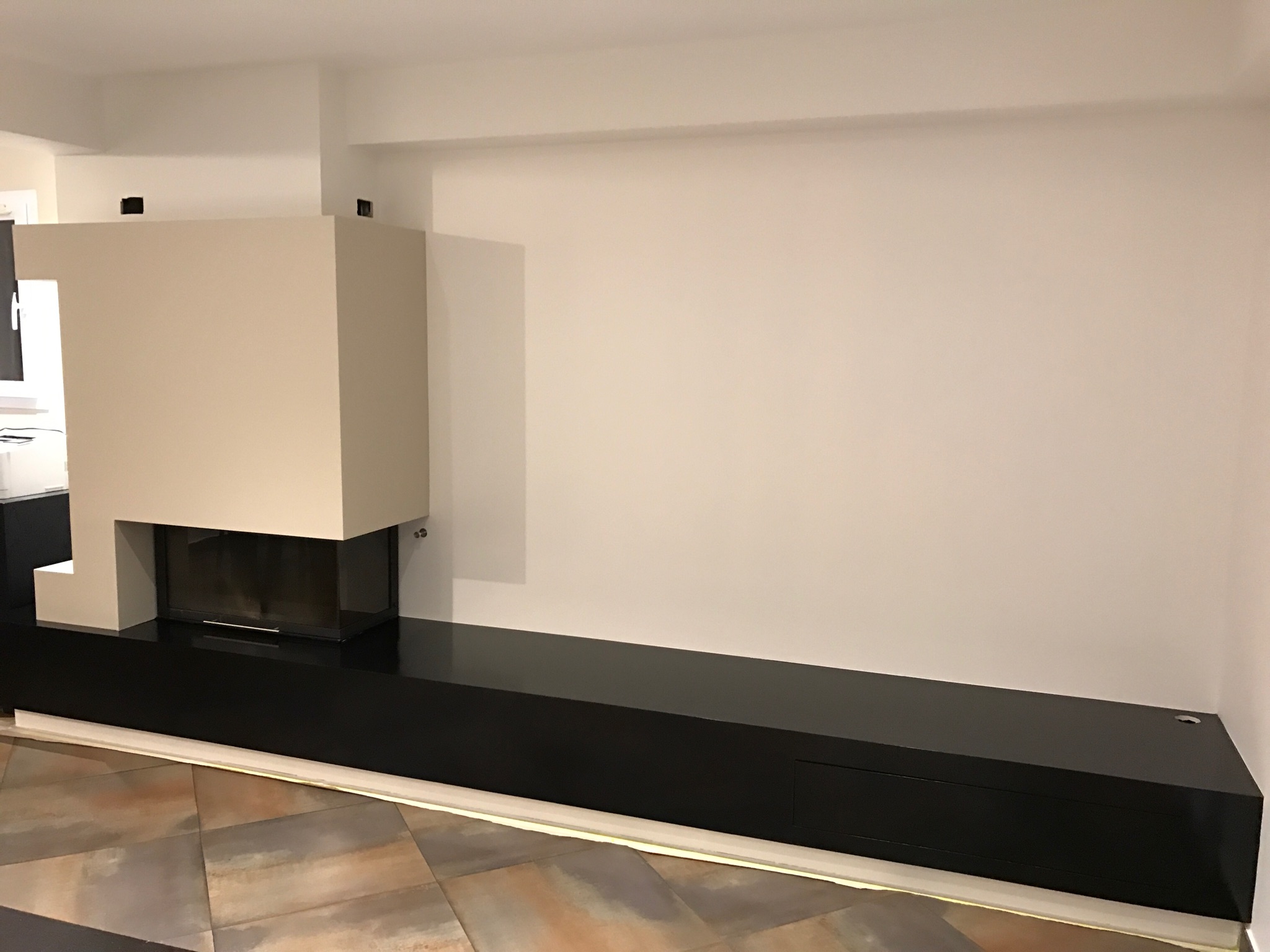 Nous avons intégrés une banquette sur la continué de la cheminée d’une longueur d’environ 3 mètres en granite noir du Zimbabwe.